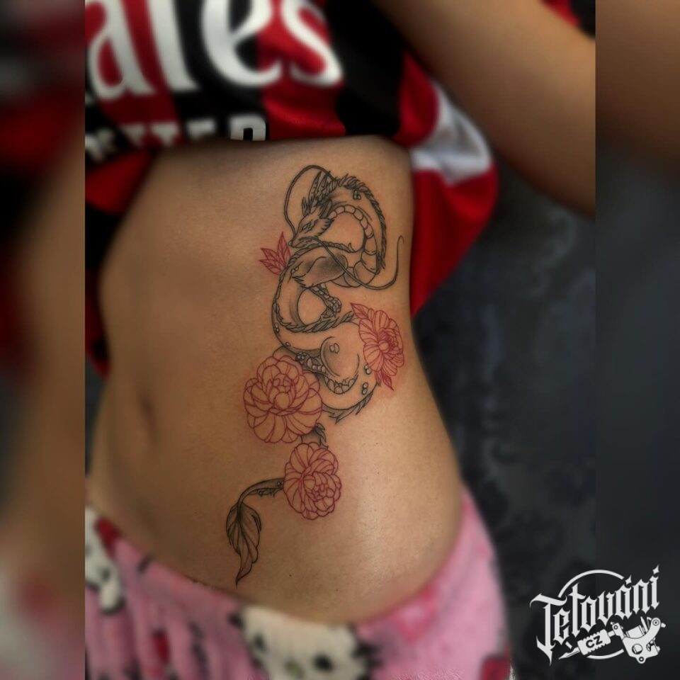 Tetování mýtická bytost drak a květiny na bok