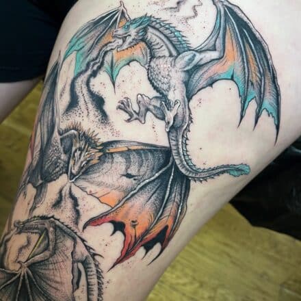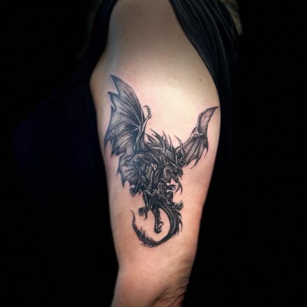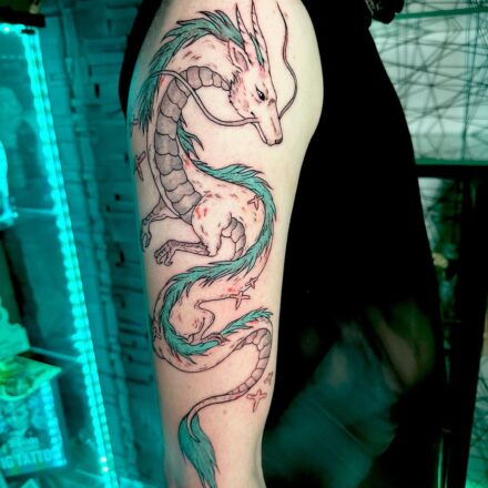 Tetování mýtická bytost, drak a maska hannya na lýtku