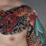 Tetování mýtická bytost drak a maska Hannya na rameno a prso