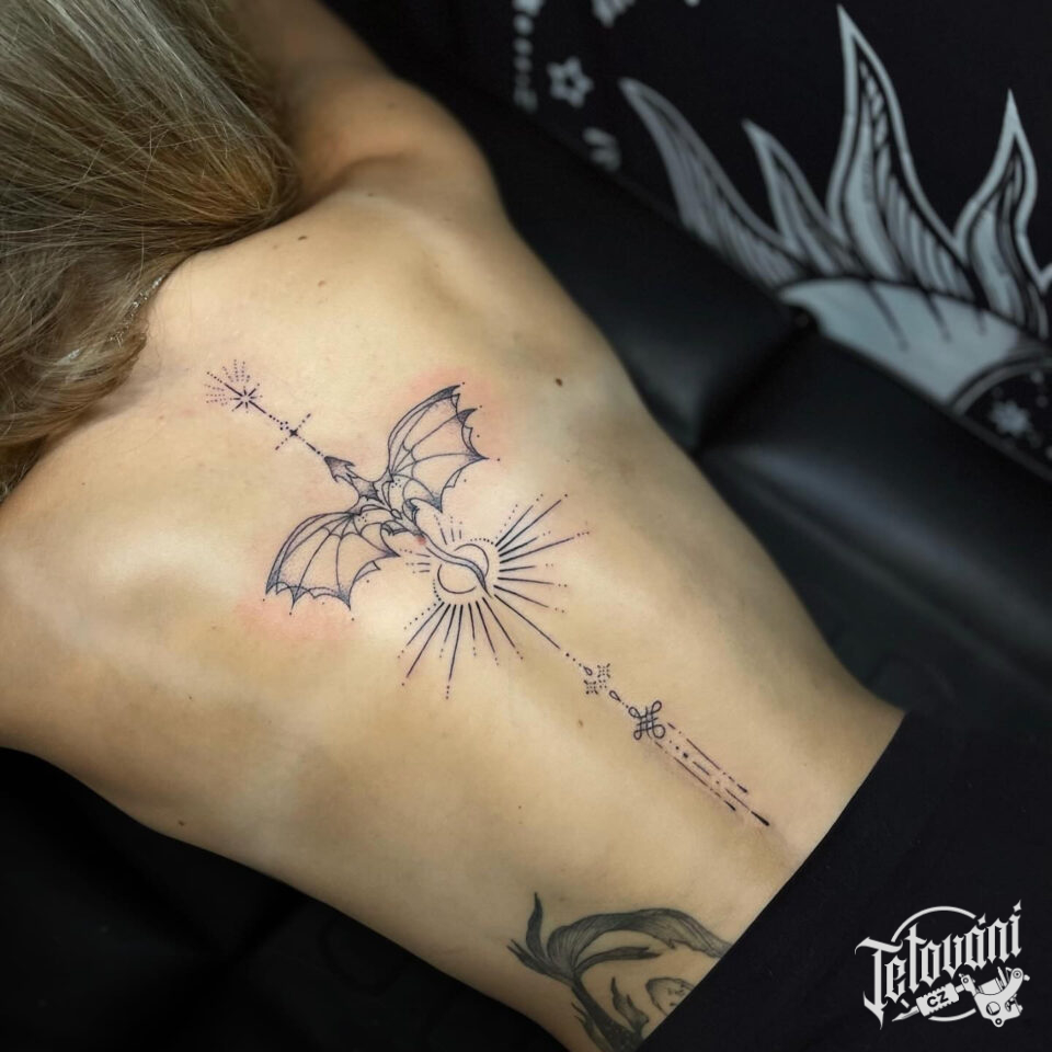 Tetování mýtická bytost, drak a ornamenty na páteři
