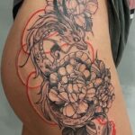 Tetování mýtická bytost drak a pivoňky, květiny na bok stehna