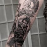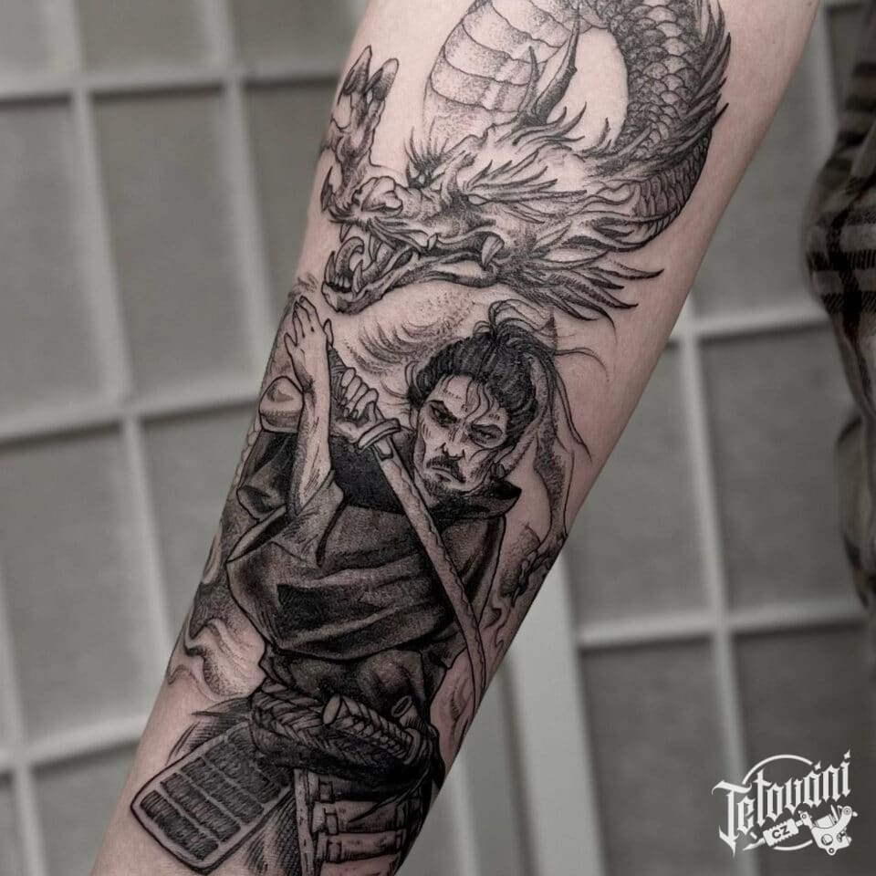 Tetování mýtická bytost, drak a samuraj na předloktí