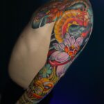 Tetování mýtická bytost drak a zvíře tygr, květiny na ruku
