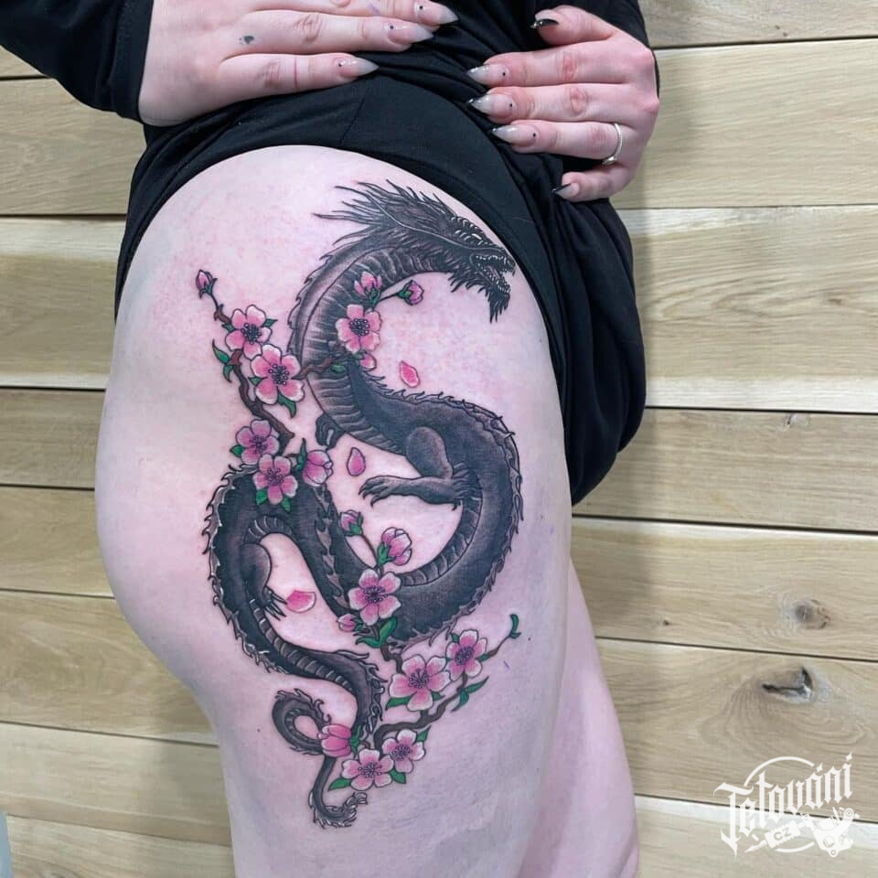 Tetování mýtická bytost, drak na a sakura na boku stehna