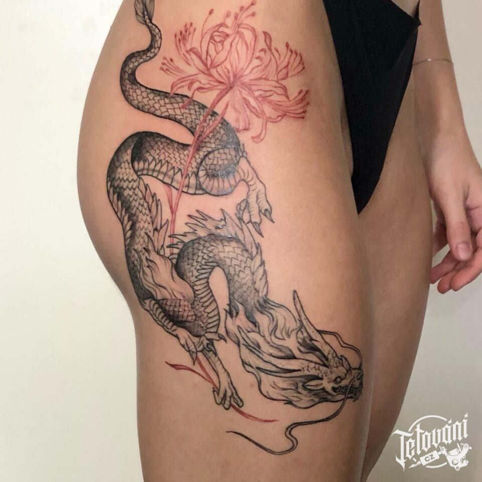 Tetování mýtická bytost drak na bok stehna