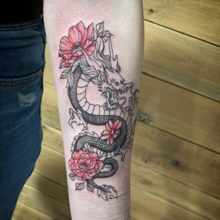 Tetování mýtická bytost drak na bok stehna