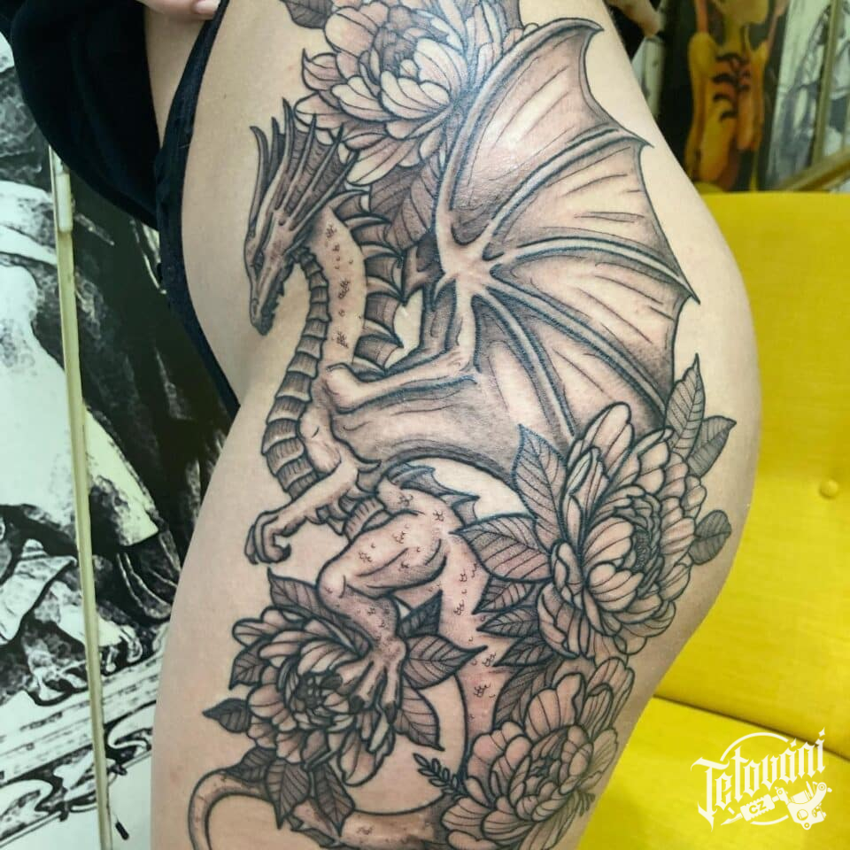 Tetování mýtická bytost drak na bok stehna