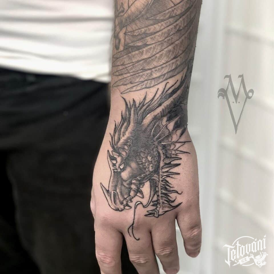 Tetování mýtická bytost, drak na hřbetu ruky