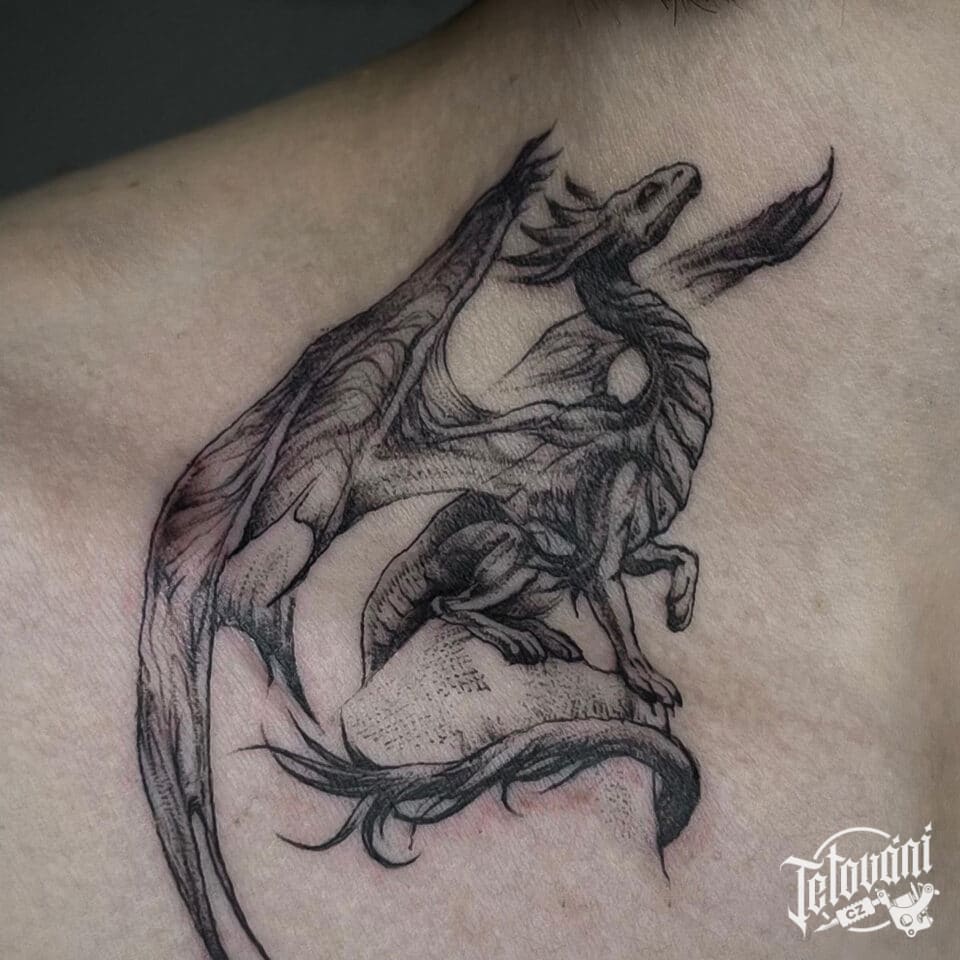 Tetování mýtická bytost, drak na hrudi