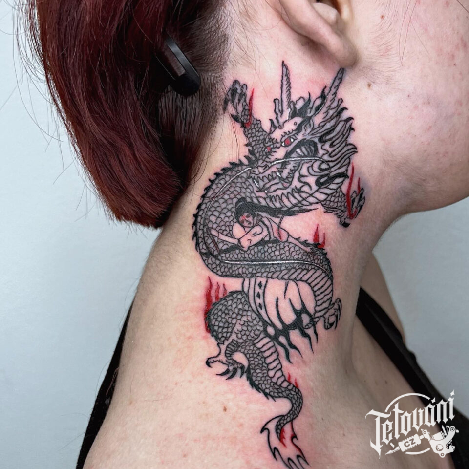 Tetování mýtická bytost drak na krk