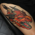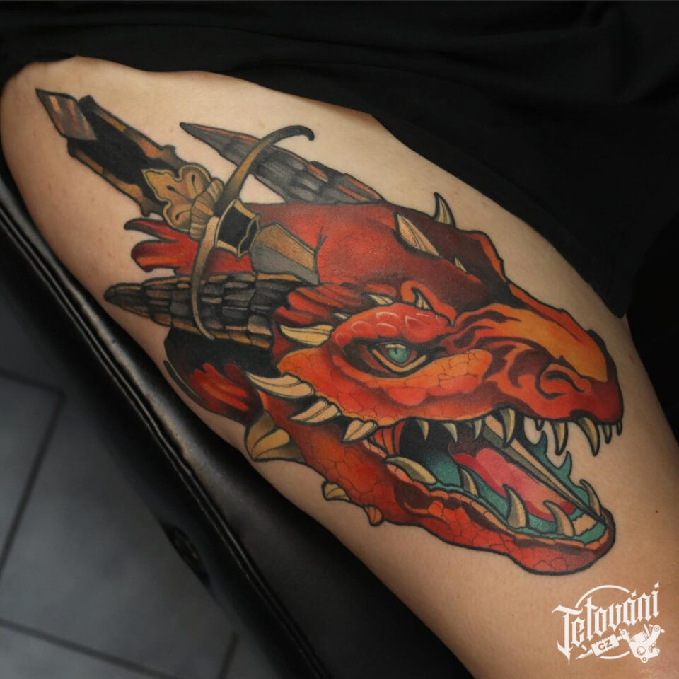Tetování mýtická bytost, drak na stehně