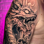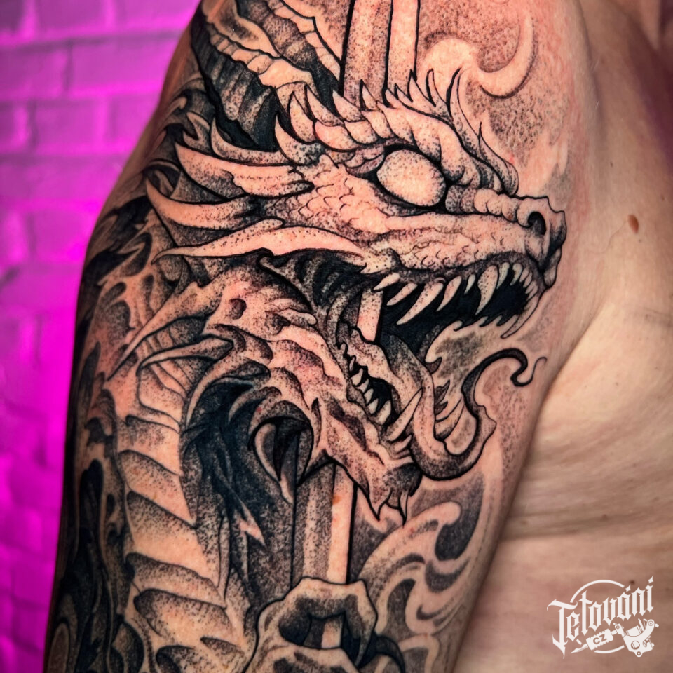 Tetování mýtická bytost drak probodnutý mečem na rameno
