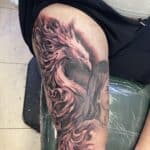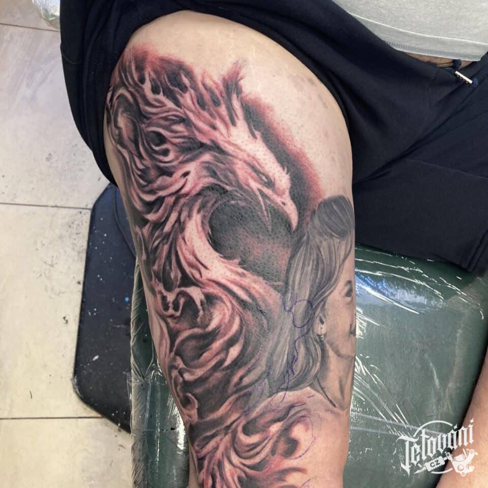 Tetování mýtická bytost, Fénix na stehně