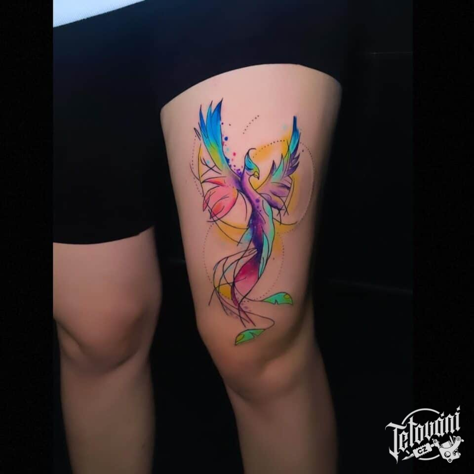 Tetování mýtická bytost fénix na stehno