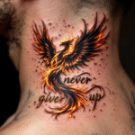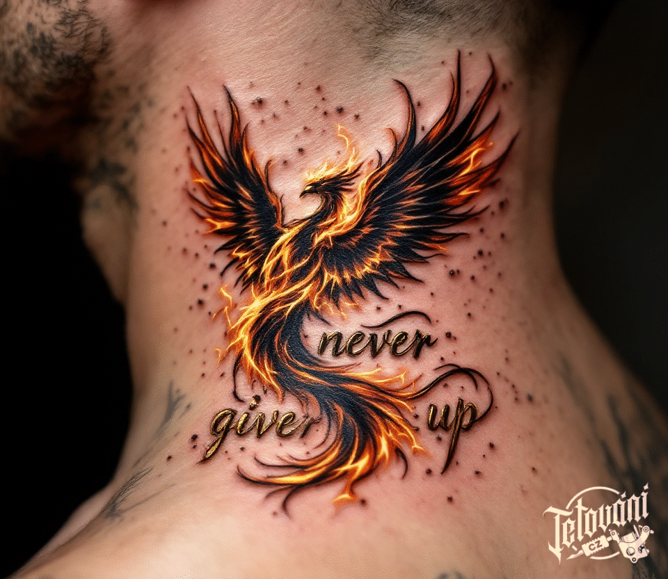 Tetování mýtická bytost fénix, never give up,, motto na krk