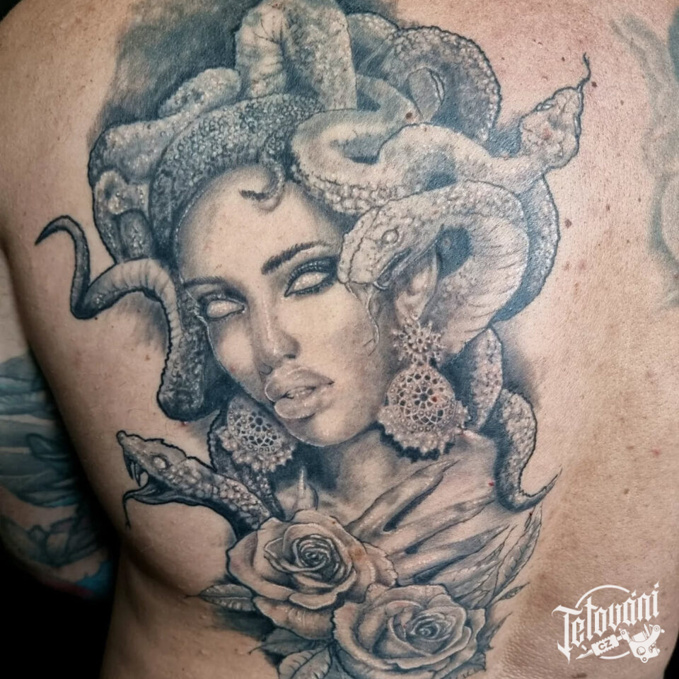 Tetování mýtická bytost medúza a růže, květiny na záda