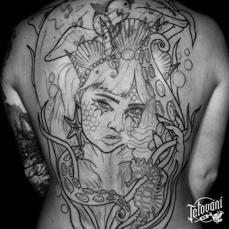 Tetování mýtická bytost mořská panna, mořský koník na záda