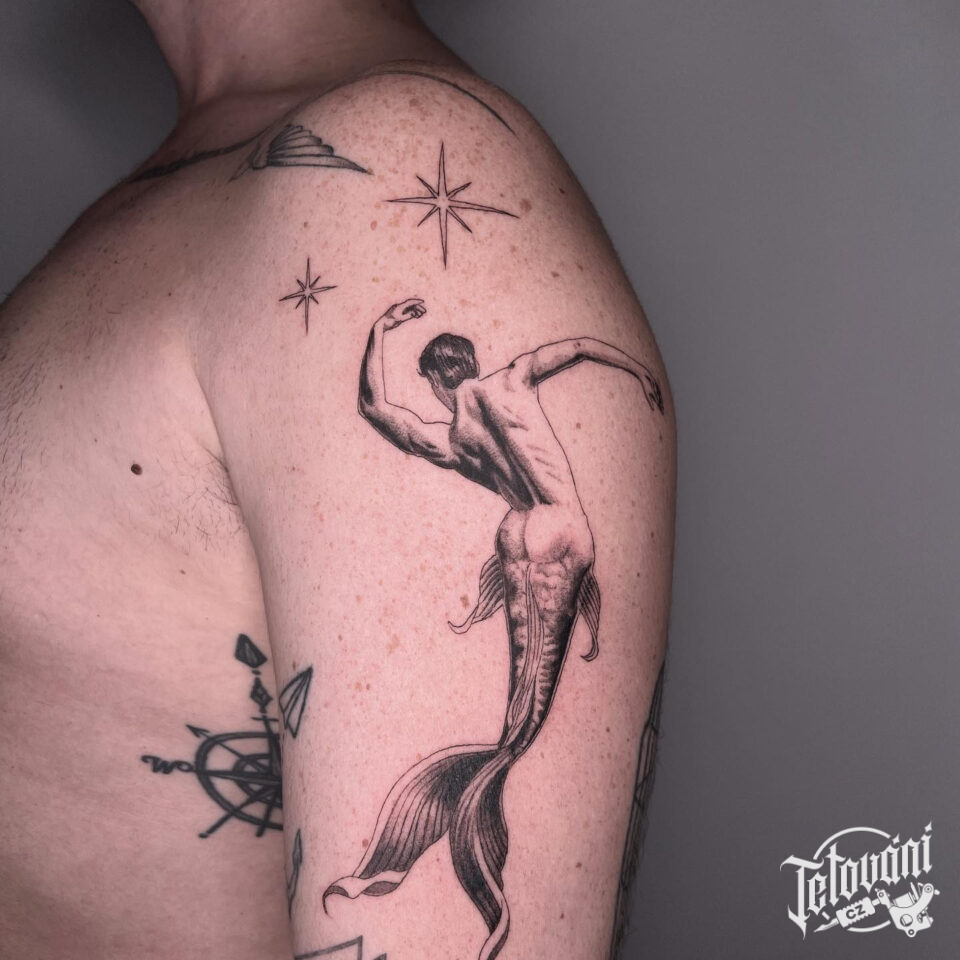 Tetování mýtická bytost, mořský muž na rameni