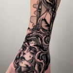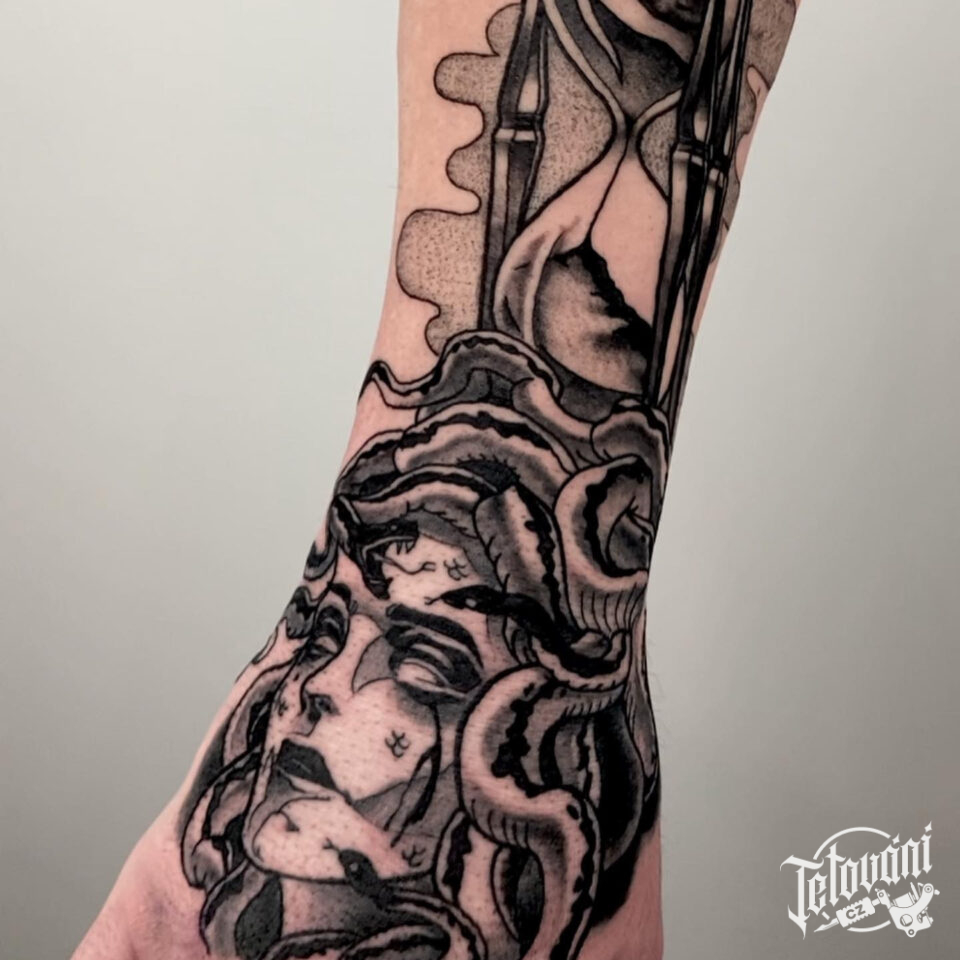 Tetování mýtická bytost, mýtická medúza na hřbetu ruky