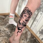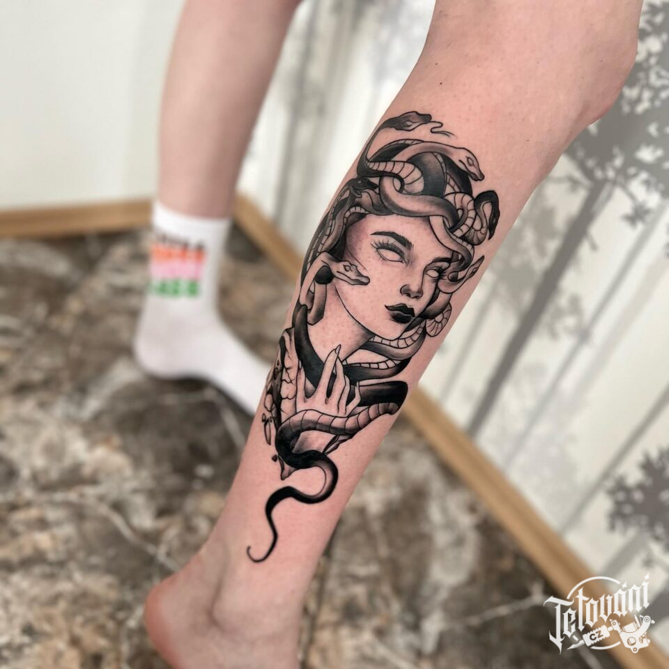 Tetování mýtická bytost, mýtická medúza na lýtku