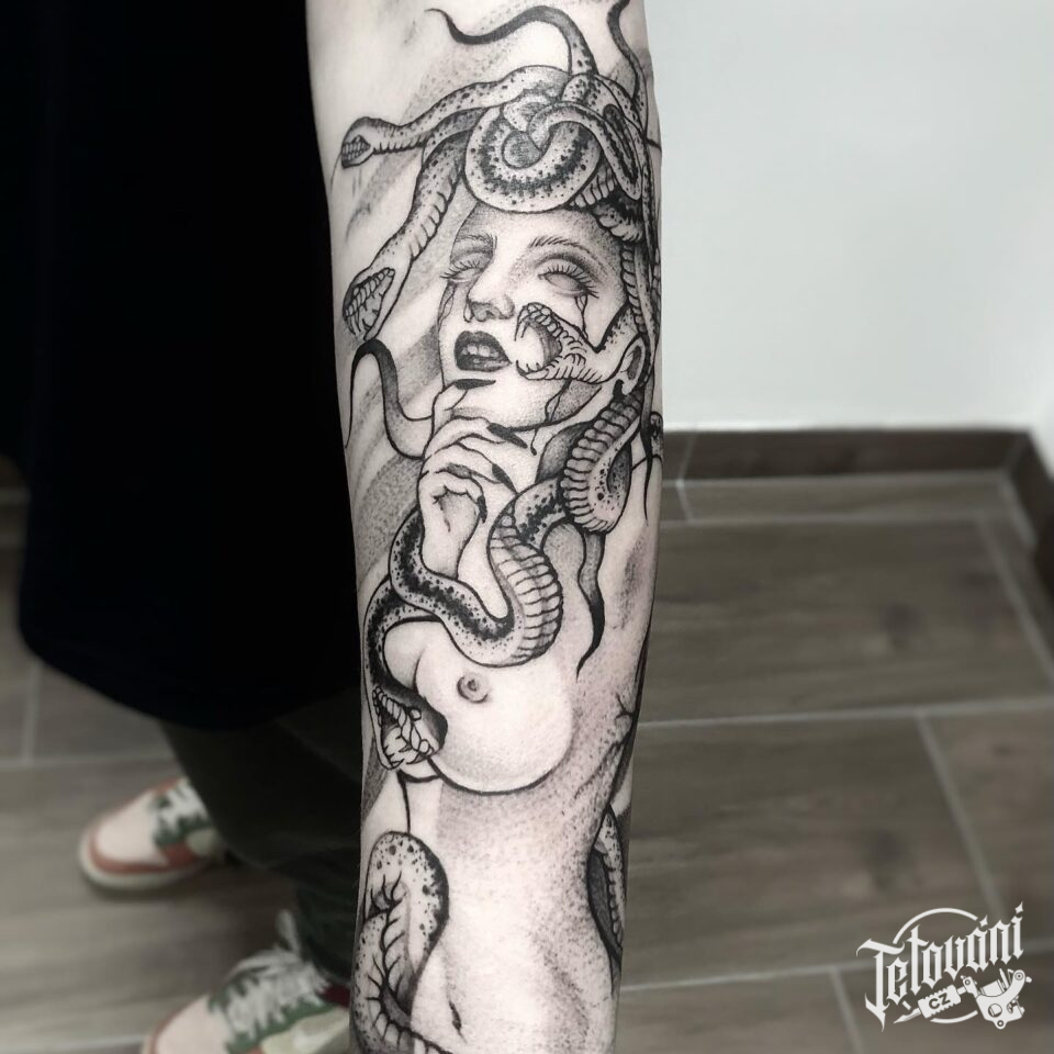 Tetování mýtická bytost, mýtická medúza na předloktí