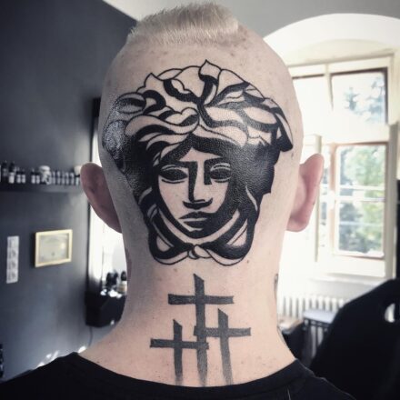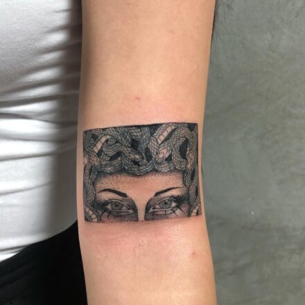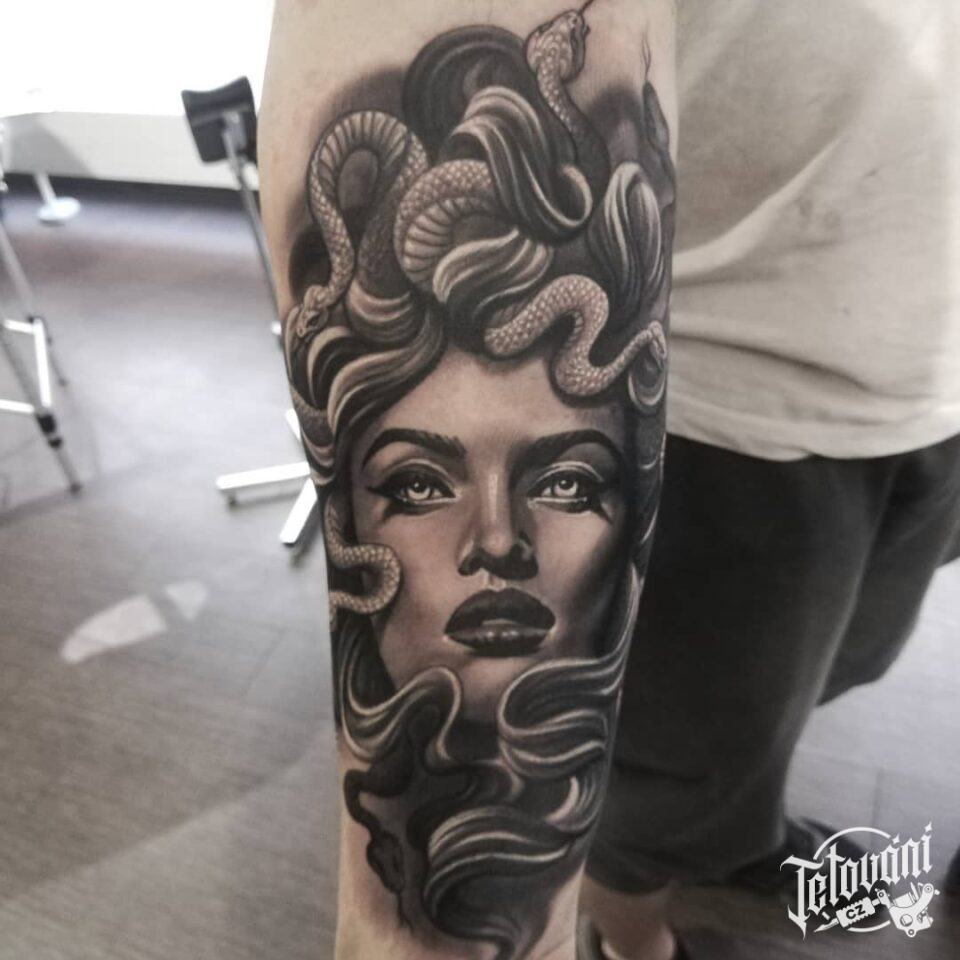 Tetování mýtická bytost, mýtická medúza na předloktí