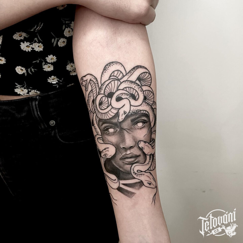 Tetování mýtická bytost, mýtická medúza na předloktí