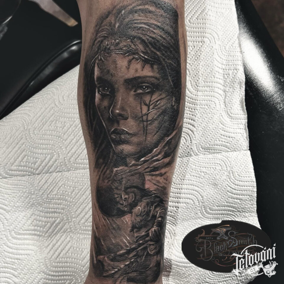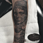 Tetování mýtická bytost, portrét Valkýry na předloktí