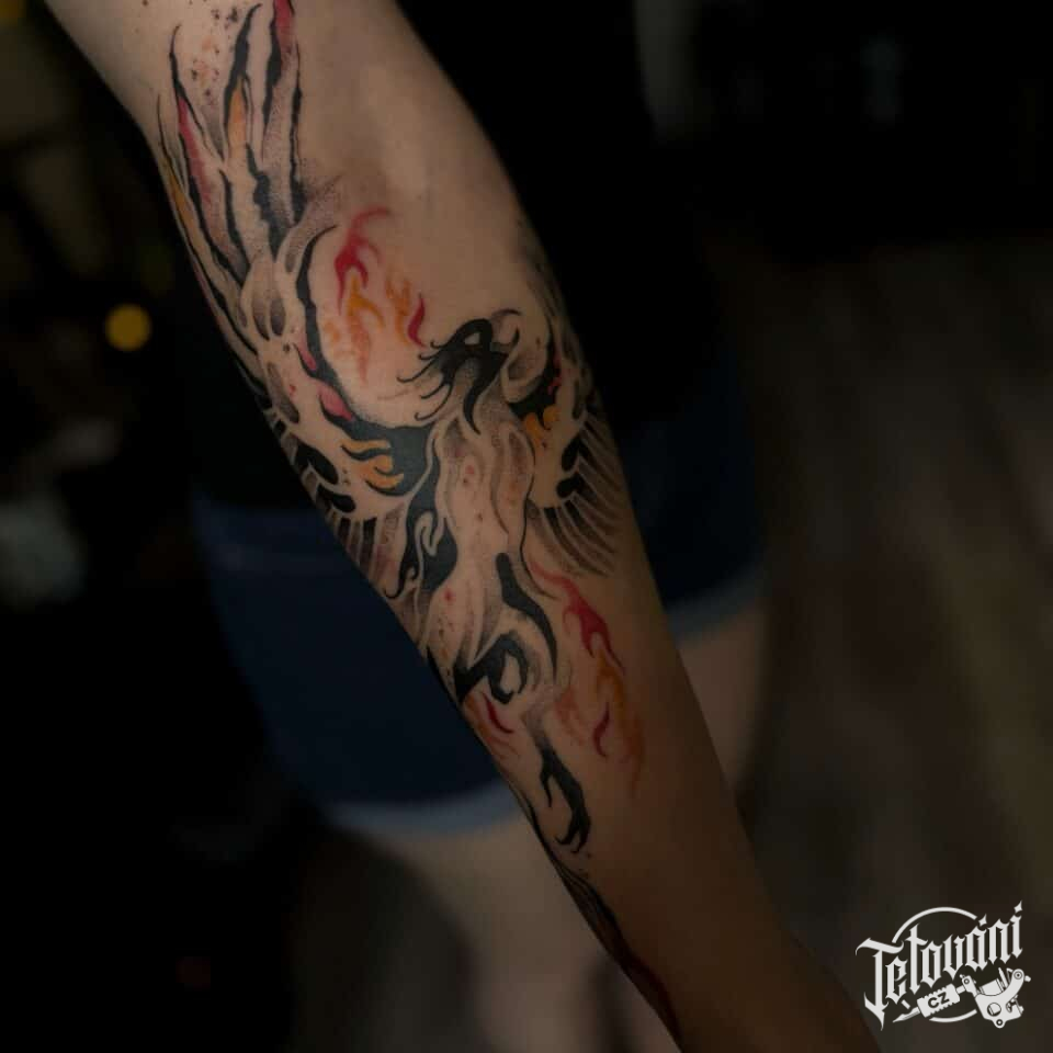 Tetování mýtická bytost, pták ohnivák na předloktí