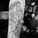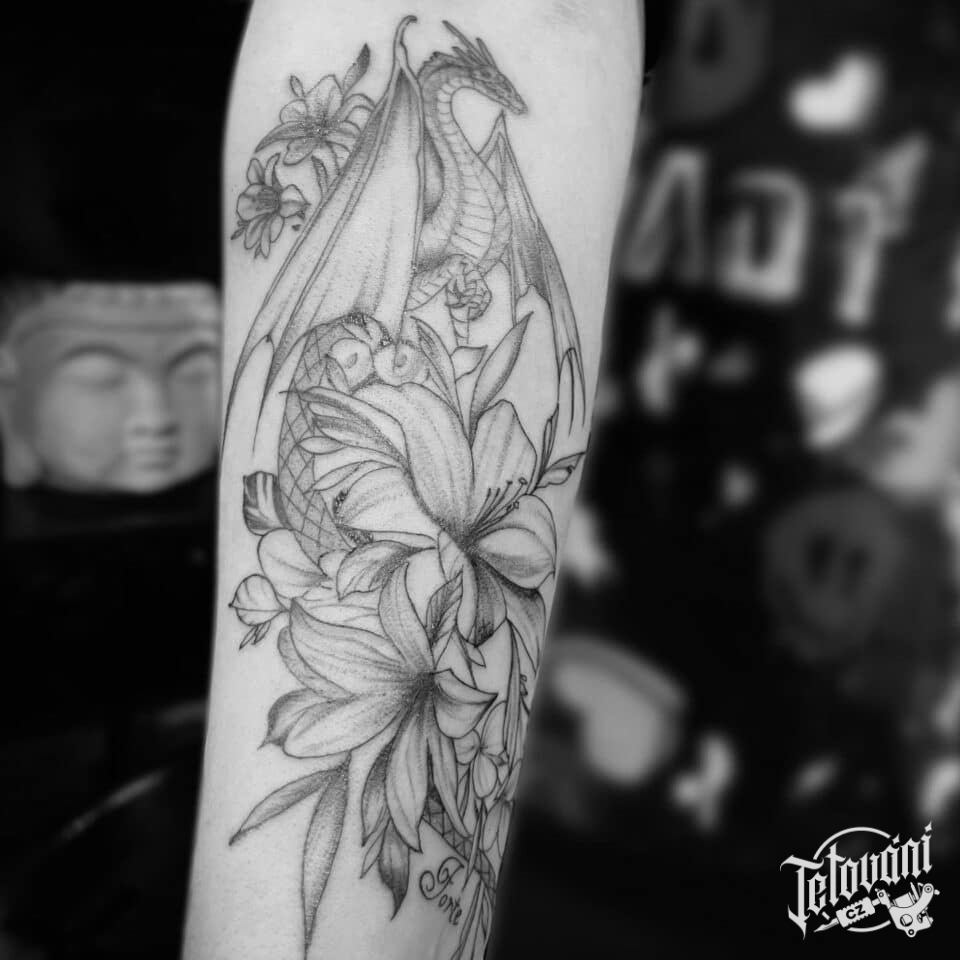Tetování mýtická bytost s květinami, drak a lilie na předloktí