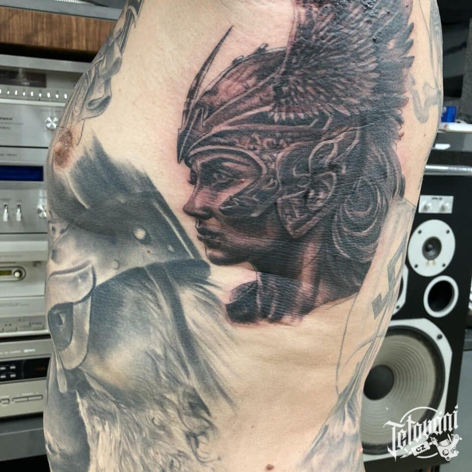 Tetování mýtická bytost, severská Valkýra na žebrech