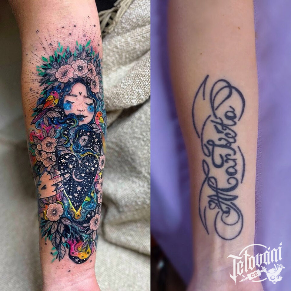 Tetování mytická bytost, srdce, květiny na předloktí
