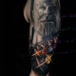 Tetování mýtická bytost Thanos z filmů Marvel, portrét, diamanty na rameno