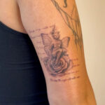 Tetování mýtická bytost, víla s růže a nápisy na ruce