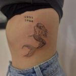 Tetování mýtická bytost z filmů a pohádek mořská panna a nápisy data narození, čísla na bok žeber