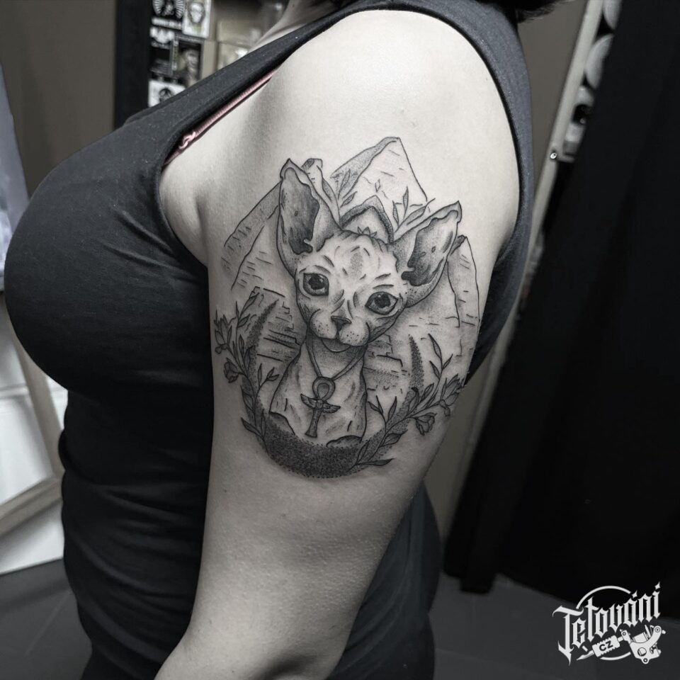 Tetování mýtická bytost, zvíře kočka, Egypt na rameno