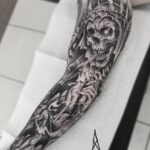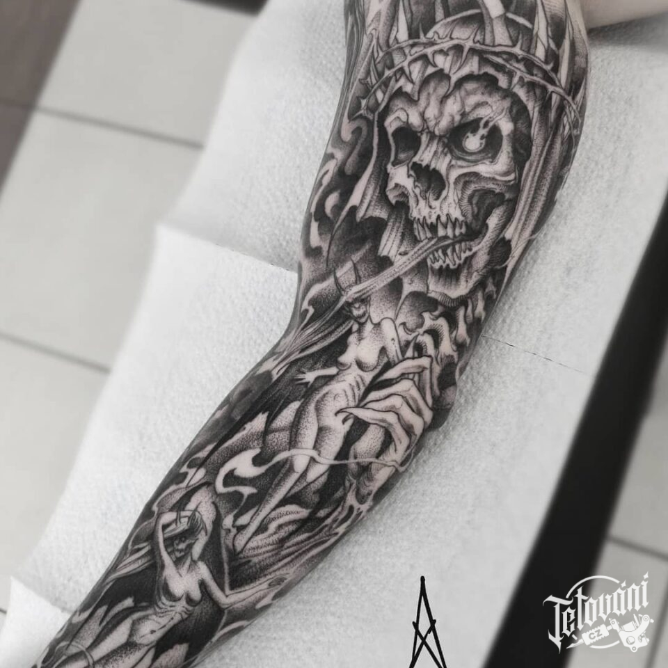 Tetování mýtické bytosti a lebka, rukáv