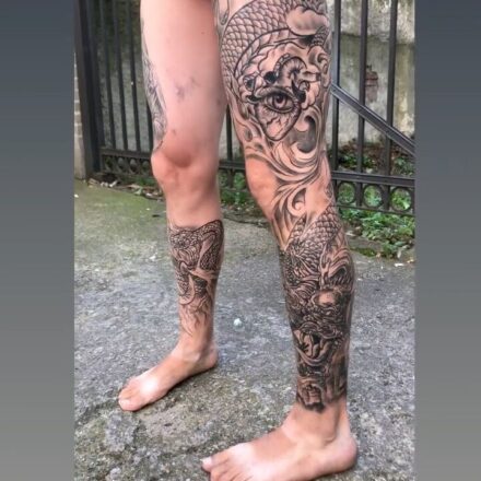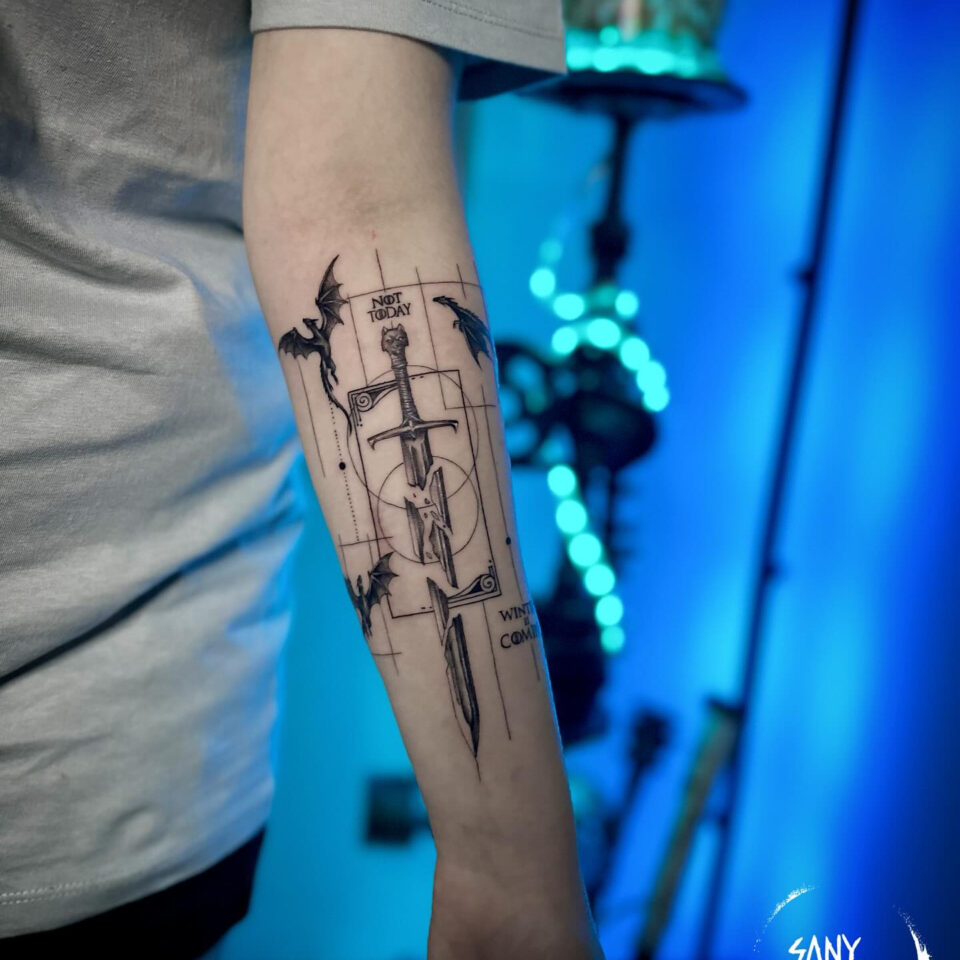 Tetování mýtické bytosti, draci, meč, čáry na předloktí