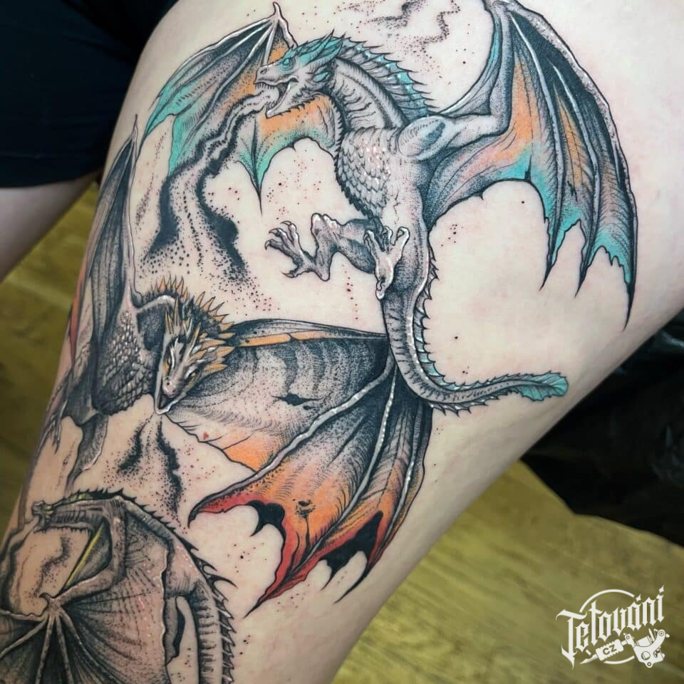 Tetování mýtické bytosti, draci na stehně