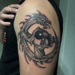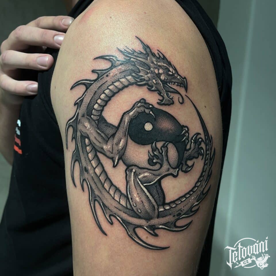 Tetování mýtické bytosti, drak a jin a jang na rameni
