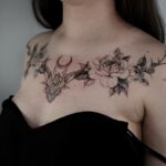 Tetování mýtické bytosti, drak a květiny na hrudi