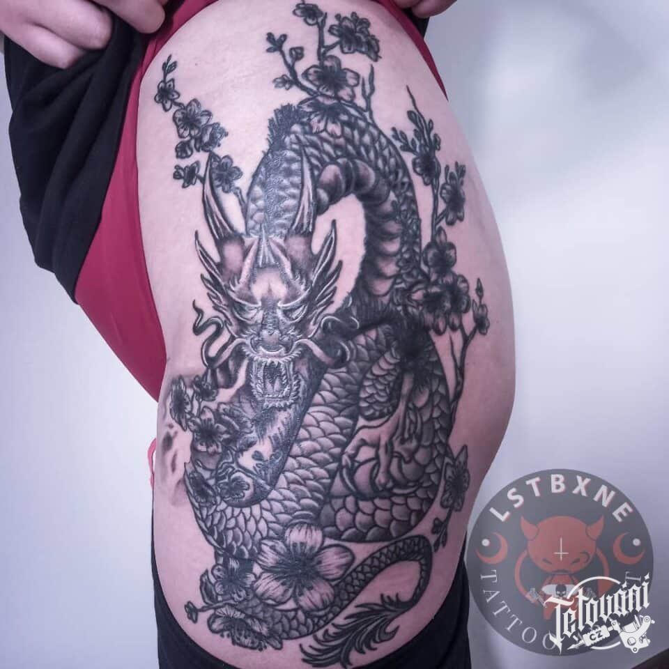 Tetování mýtické bytosti, drak a sakura na boku stehna