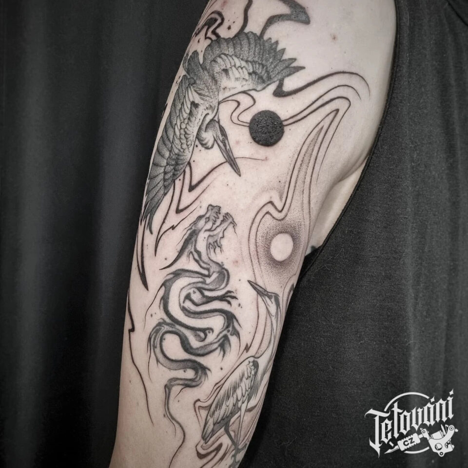 Tetování mýtické bytosti, drak a zvířata pták na rameno