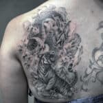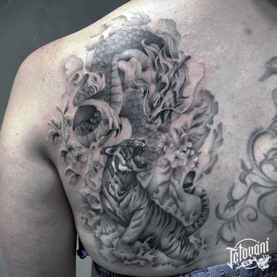 Tetování mýtické bytosti drak a zvířata, tygr a květiny na lopatce