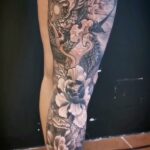 Tetování mýtické bytosti, drak, květiny na noze