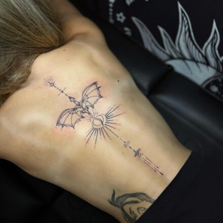 Tetování mýtické bytosti, drak, květiny na paži