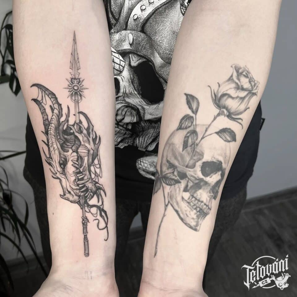 Tetování mýtické bytosti, drak, lebka a růže na předloktí