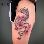 Tetování mýtické bytosti, drak na boku stehna