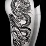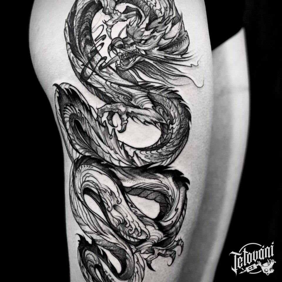 Tetování mýtické bytosti, drak na boku stehna