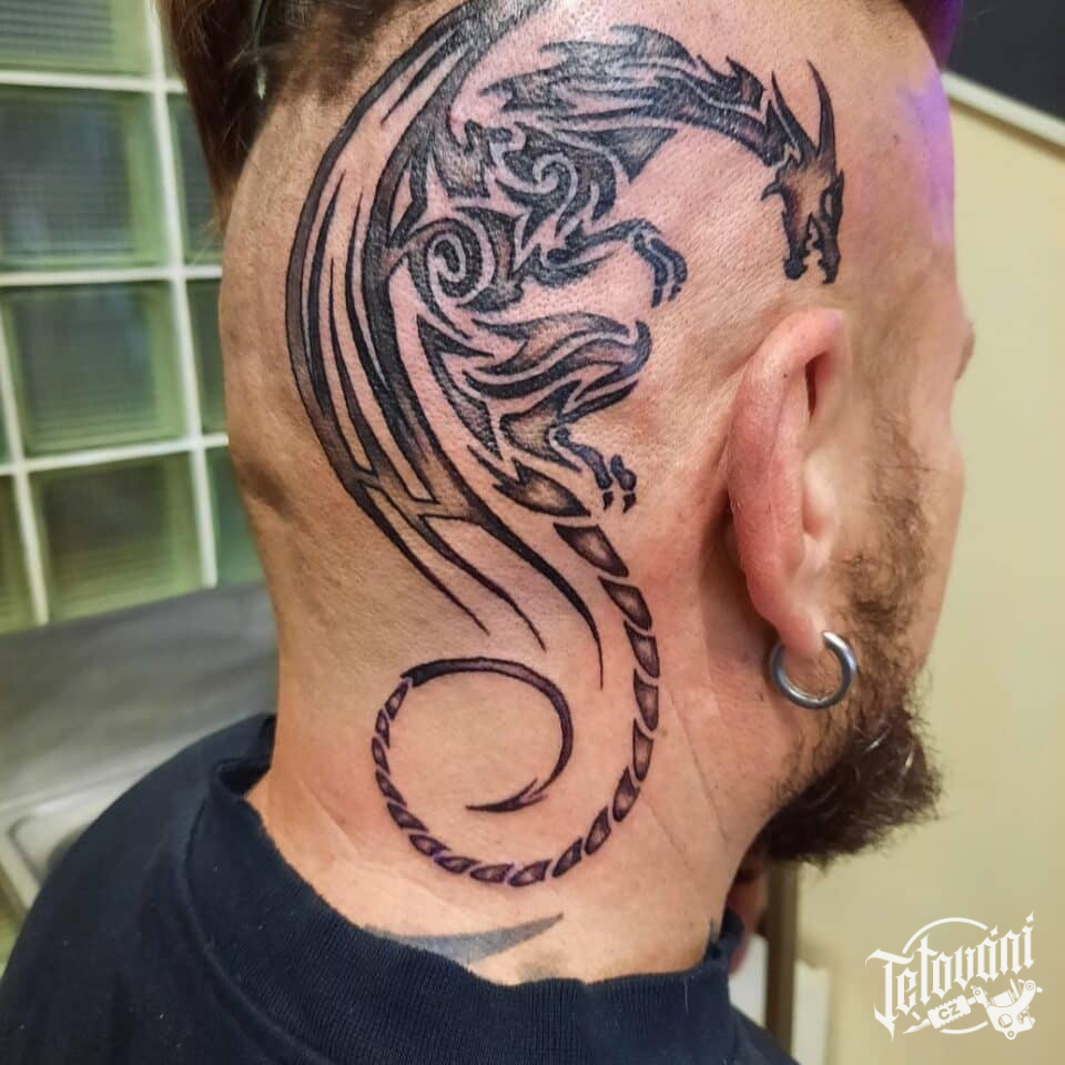 Tetování mýtické bytosti, drak na hlavě